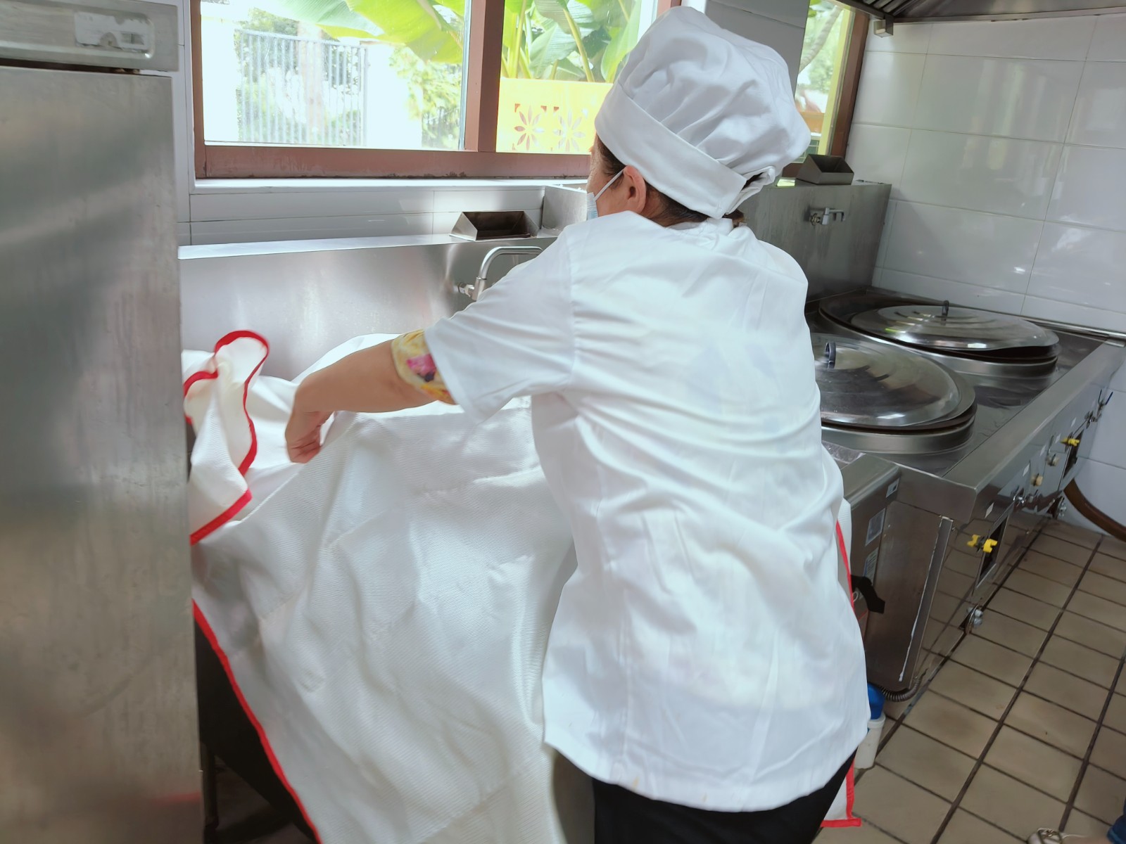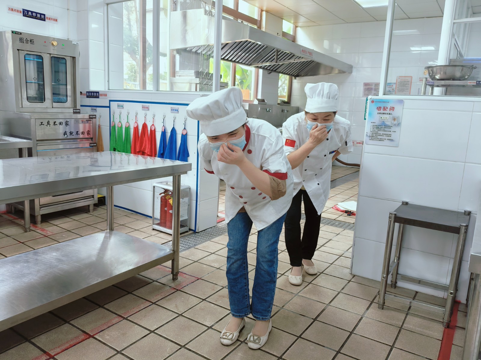 首先,安全负责人触发模拟火情后,食堂工作人员迅速反应,快速关闭油锅阀门并盖上锅盖。
