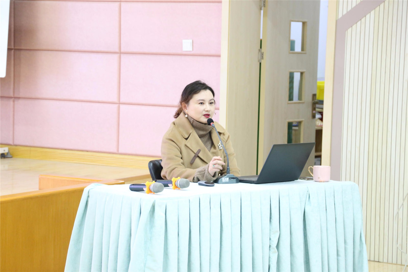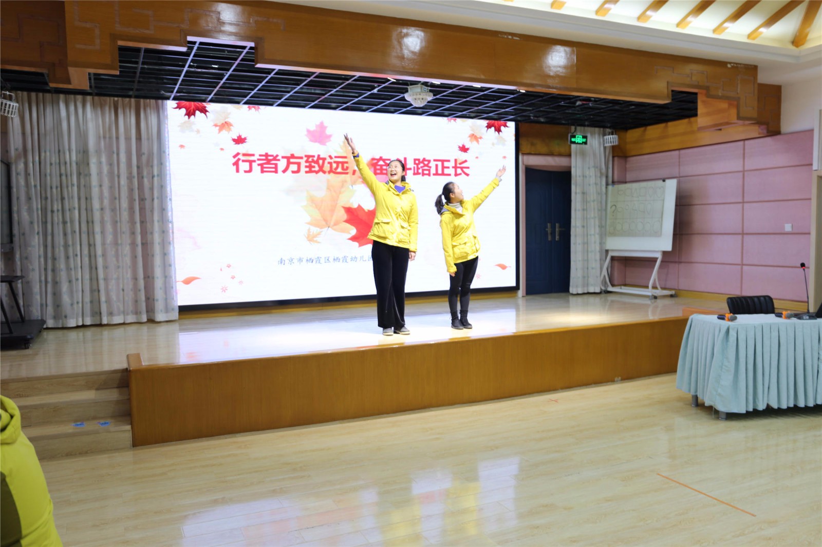 参观结束回到多功能厅,我园万紫薇、陈雯鑫、汪亭亭三位新教师通过诗朗诵的形式表达了入职后的心得体会,在优美的钢琴伴奏下倾情清唱栖幼园歌,向全体新教师展示自己作为新教师的成长经历。